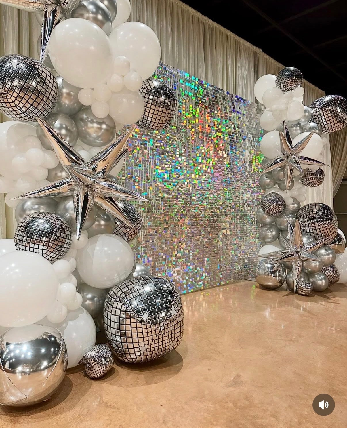 Shimmer wall backdrop with a custom balloon garland, available in gold or iridescent finishes to match your event style.